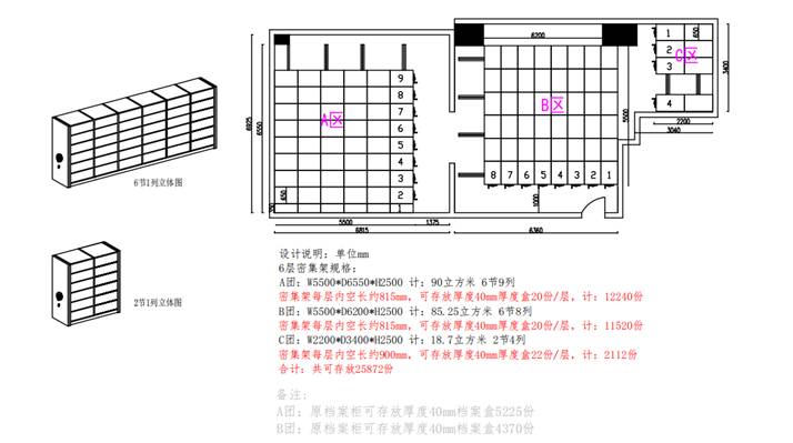 設(shè)計(jì)思路: 根據(jù)檔案庫房尺寸以及用戶實(shí)際需求后,我司提交了如下設(shè)計(jì)稿:
